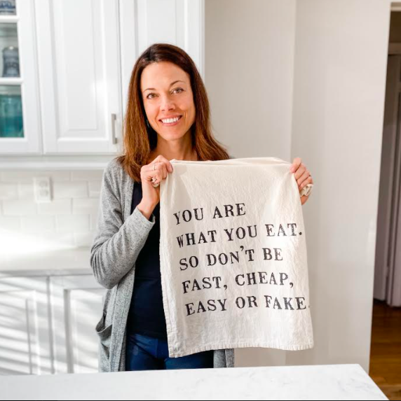 Shop the perimeter of the grocery store where all the fresh foods are displayed, carefully read the labels when buying packaged foods and think twice about eating foods that don’t expire in the time it takes to get a four year degree in nutrition. Like my dish towel says, you are what you eat, so don’t be fast, cheap, easy or fake.