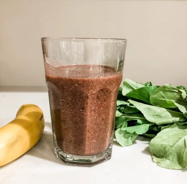 Add a cup of frozen dark cherries, a fresh or frozen banana, ¼ cup raw cashew nuts for creaminess and some fresh spinach into your blender. Add equal parts orange juice and water until the fruit is about halfway covered with liquid, plus a few ice cubes. I usually add a tablespoon of chia seeds. Blend away and enjoy!